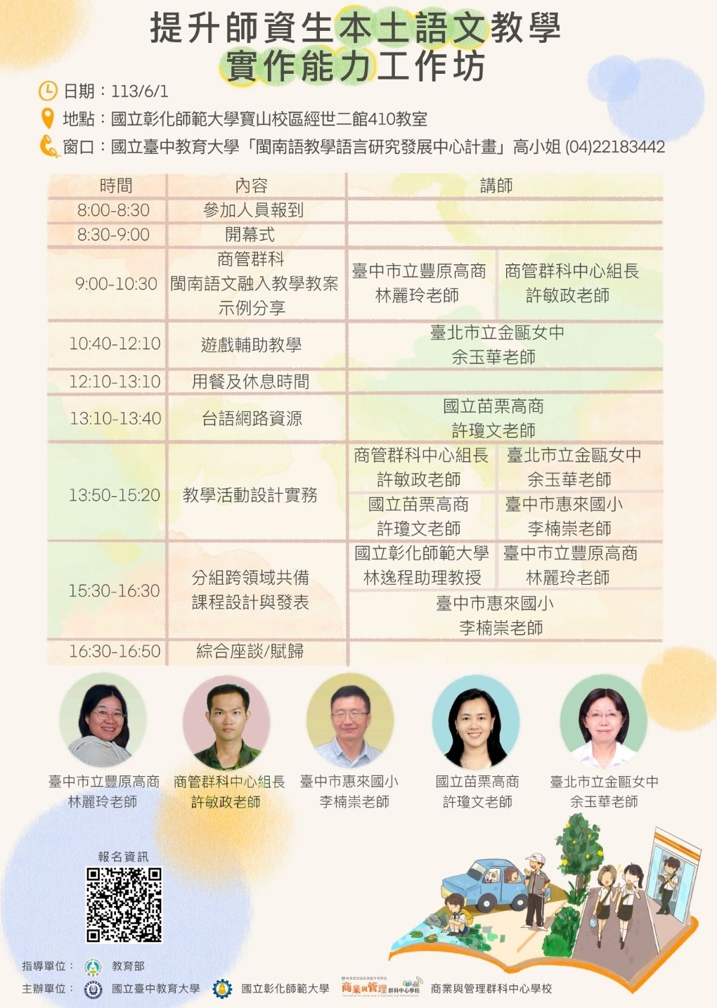 三、辦理單位:國立臺中教育大學「閩南語教學語言研究發展中心計畫」、師資培育暨就業輔導處、國立彰化師範大學、商業與管理群科中心學校(臺中市立臺中家商)。