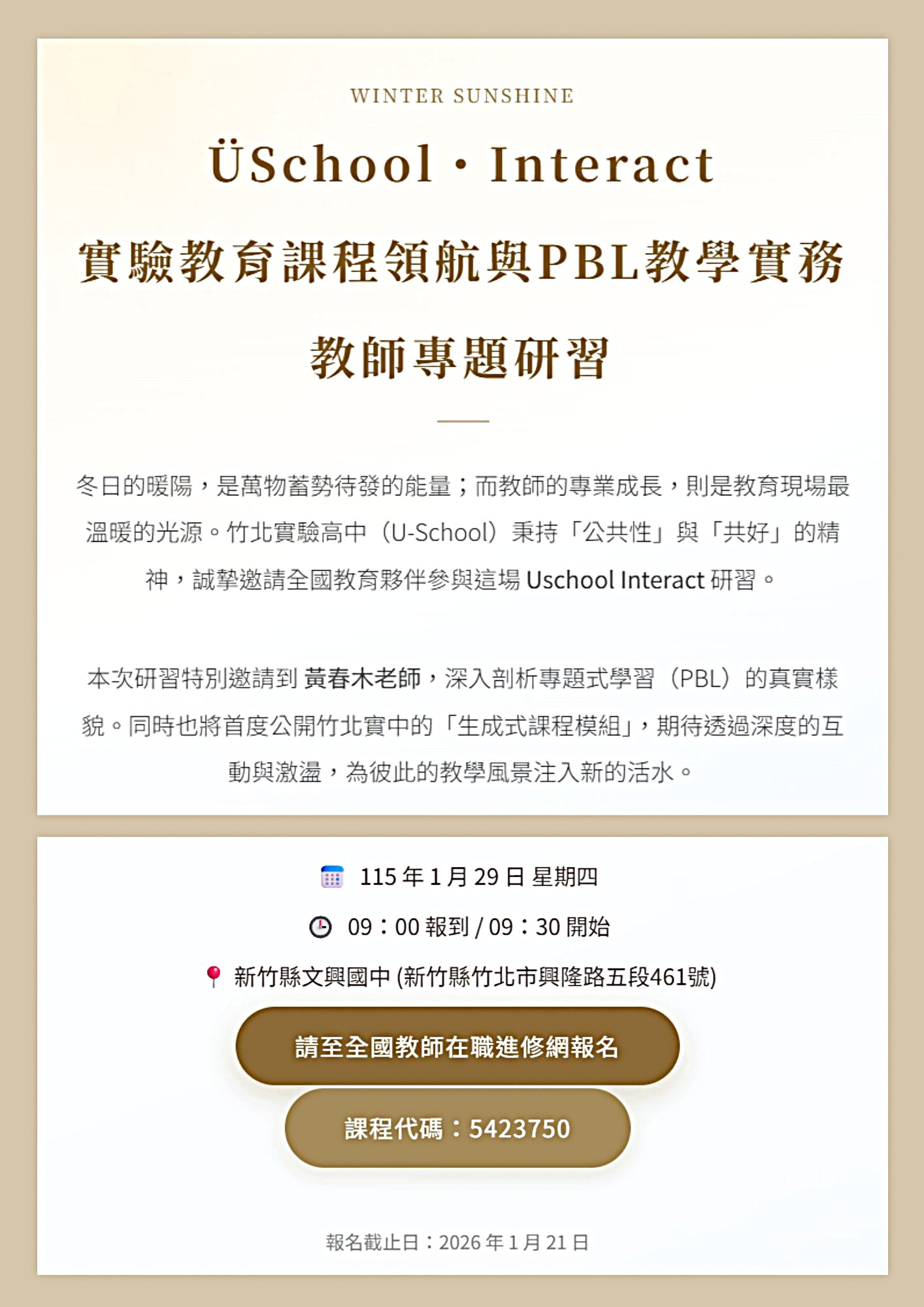 報名方式:請於115年1月21日前至教育部全國教師在職進修資訊網(https://www1.inservice.edu.tw/)報名,課程代碼:5423750;全程參加核給研習時數6小時。