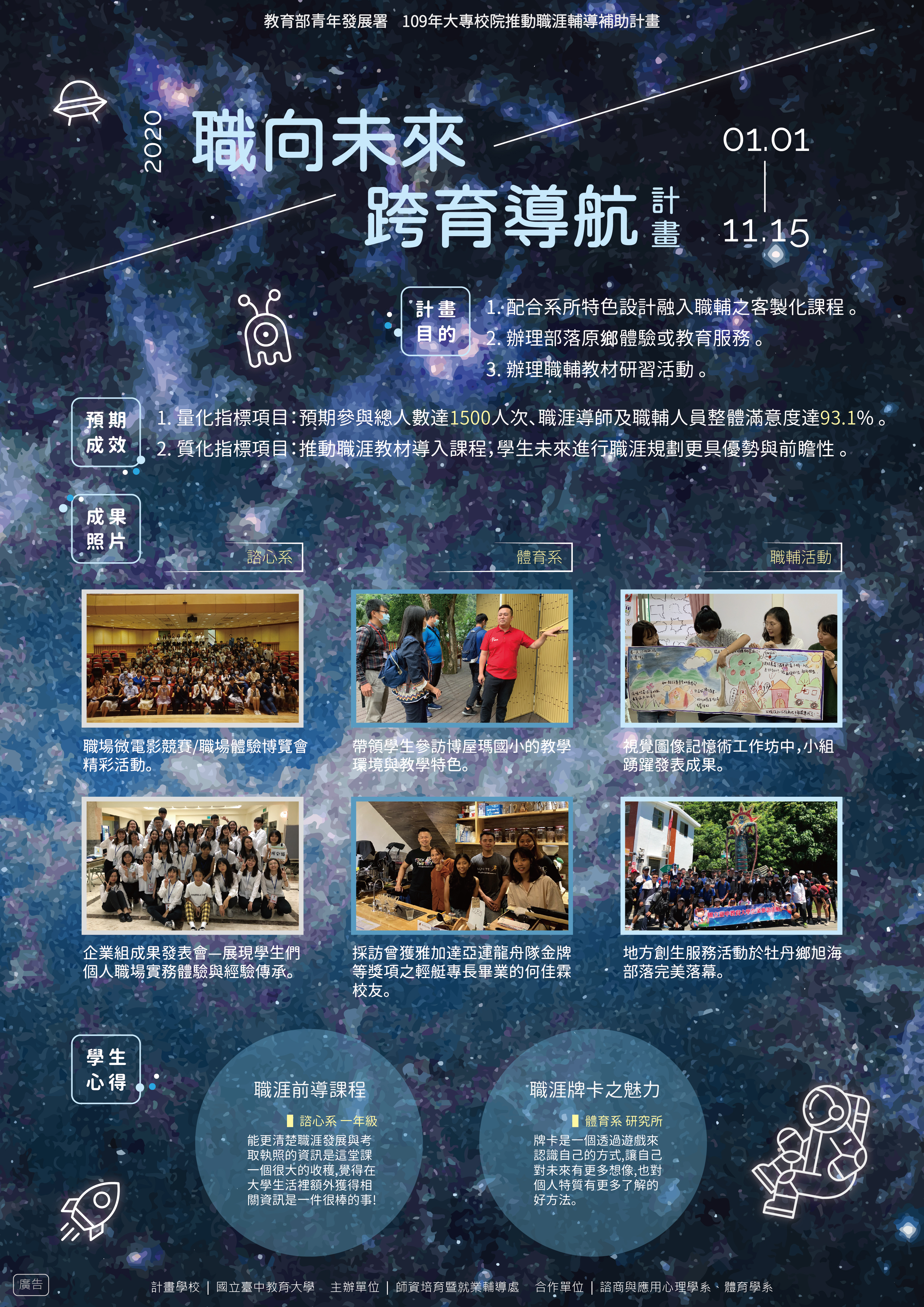 本處執行跨域計畫,配合系所特色設計融入職輔之客製化課程,本年度與諮心系、體育系合作規劃職涯發展特色課程,給學生不同的學習體驗。