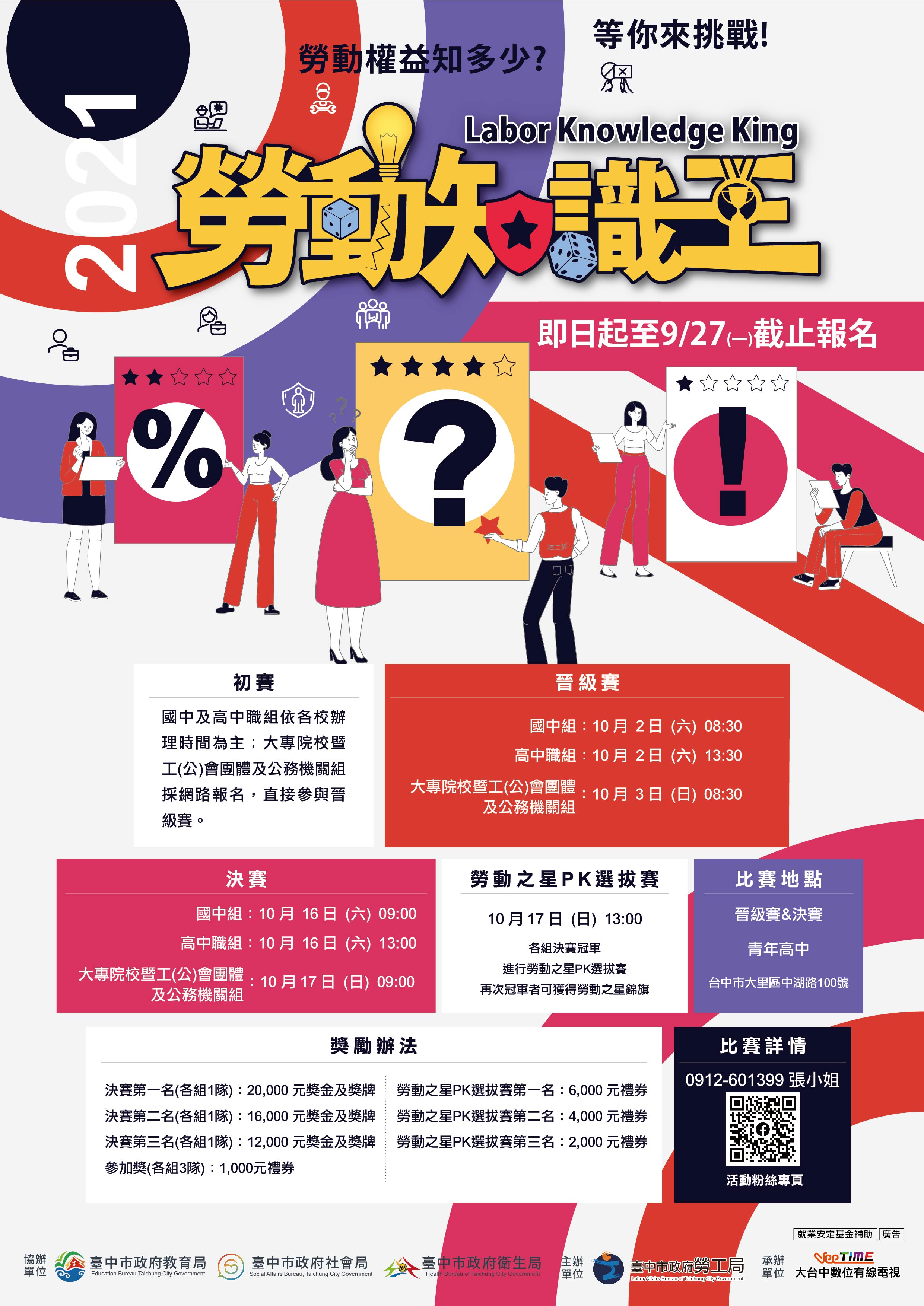 3.本活動詳情及報名徵選相關事宜,請上活動粉絲團查詢(https://www.facebook.com/pg/LaborKnowledgeKing/),挑戰勞動知識王活動報名期間:即日起至110年9月27日(一)止,活動相關聯絡事宜請洽0912-601399張小姐;提升青年勞動意識體驗活動報名期間:即日起至110年9月24日(五)止,相關聯絡事宜請洽04-23112178分機6607或04-22289111分機35262林小姐。