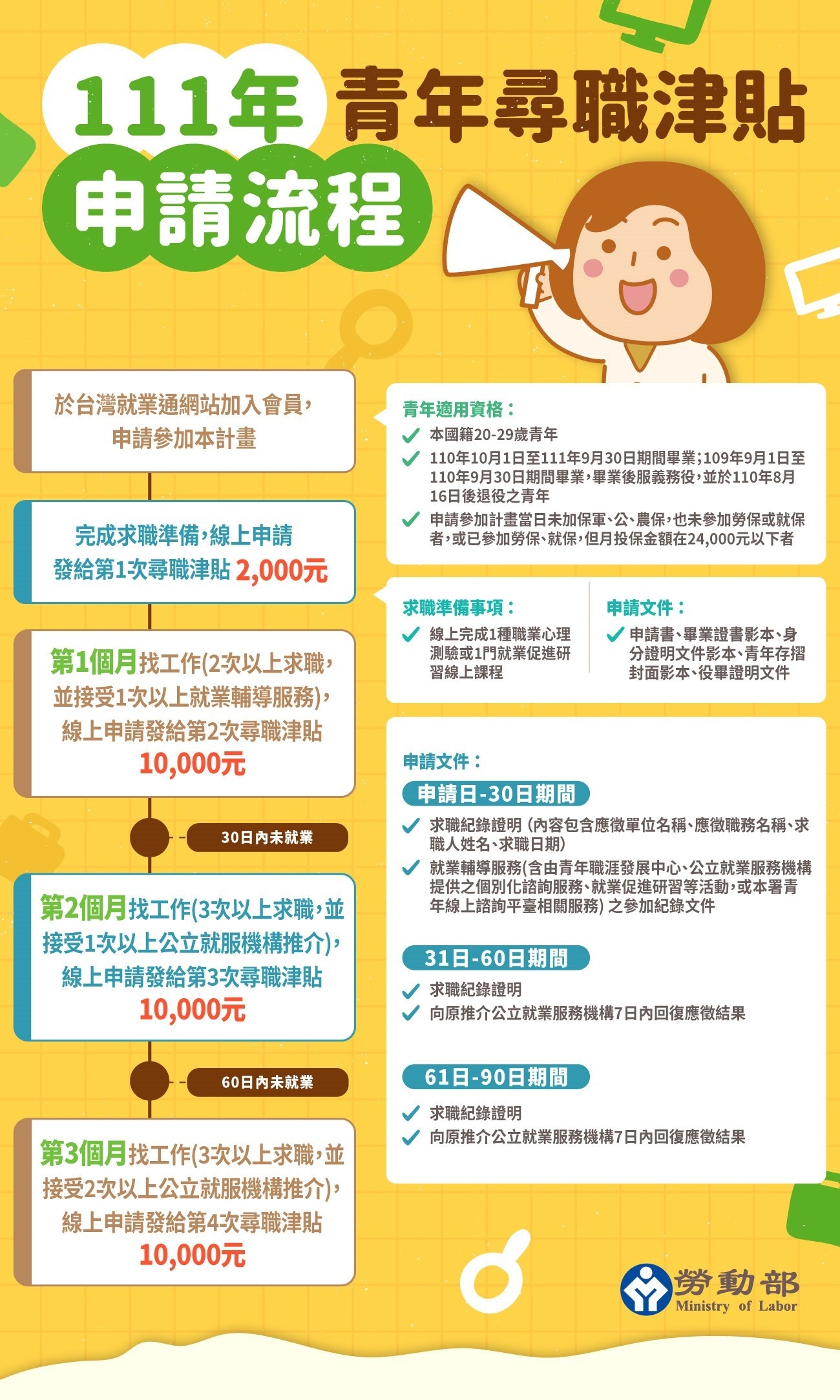 津貼申請條件:三個月內進行求職,並接受就業輔導獲推介服務者,分4階段發給尋職津貼最高可請領3萬2千元。