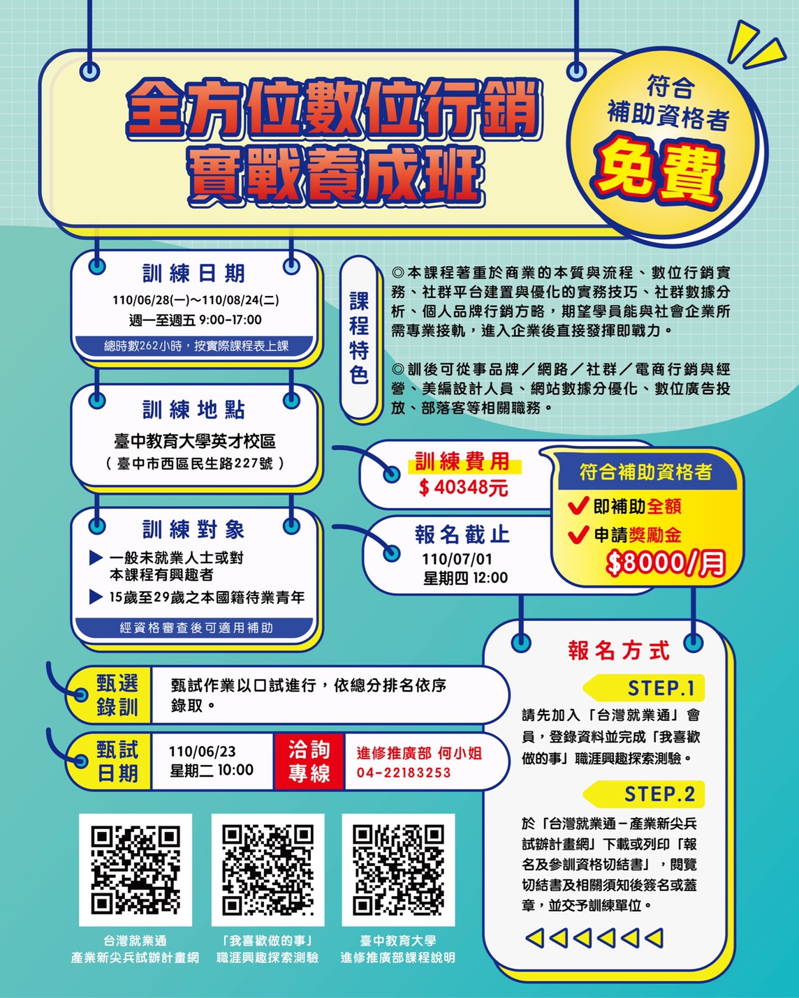 | 就業輔導組 | 臺中教育大學免費數位行銷課程!還可以領學習獎勵金! | DM |