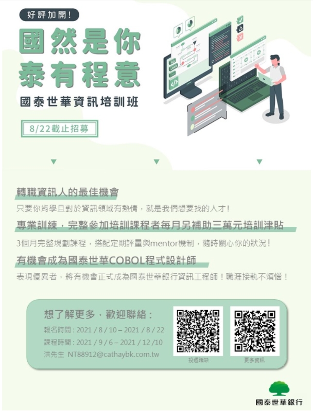 | 就業輔導組 | 國泰世華銀行2021 國泰COBOL資訊培訓班 | DM |