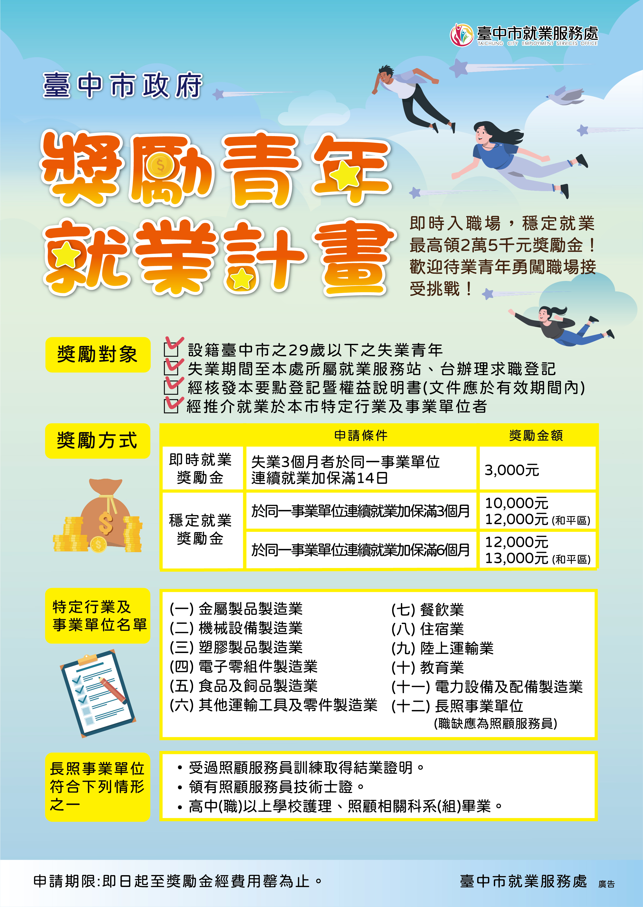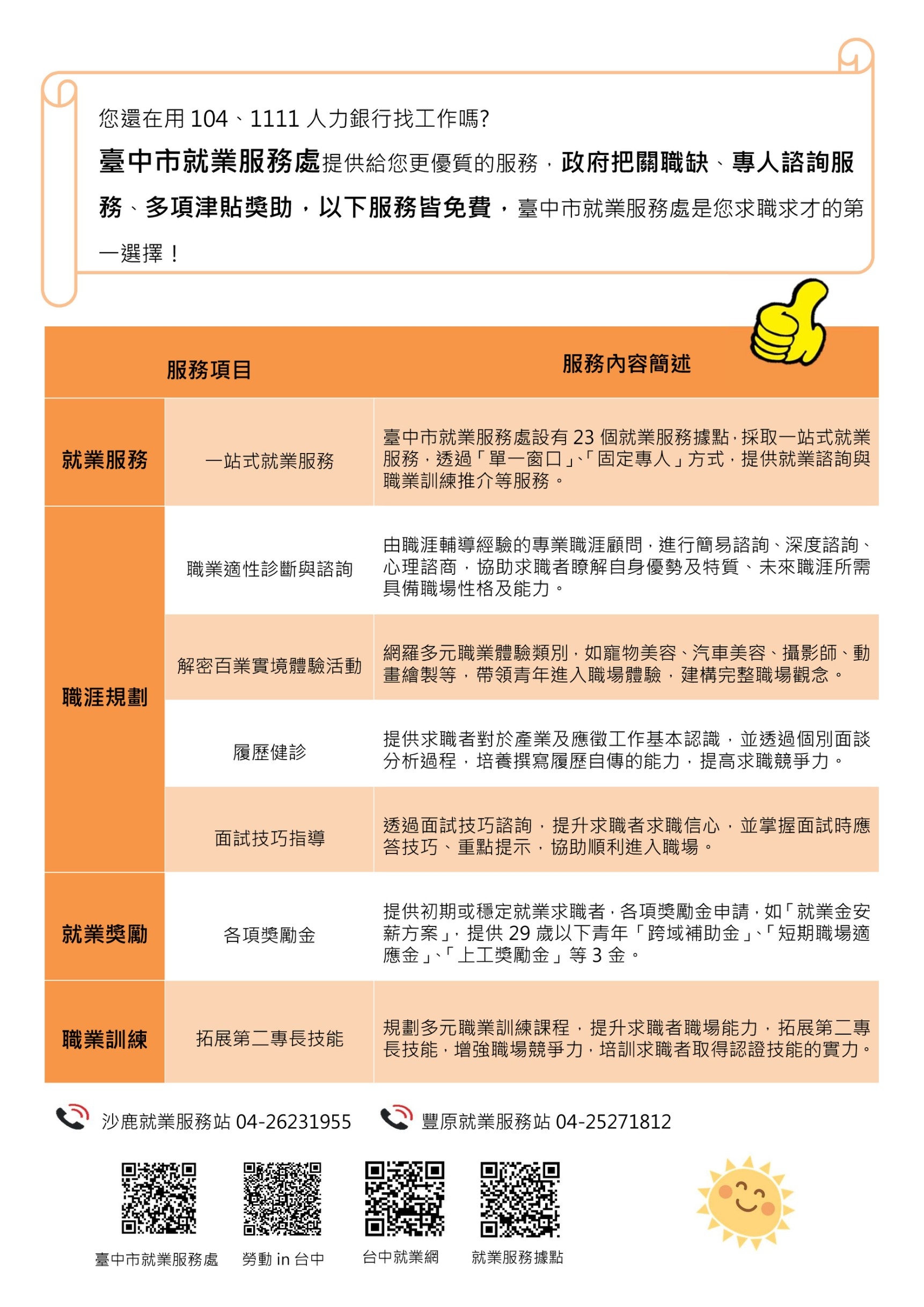 | 就業輔導組 | 轉知:臺中市政府勞工局獎勵青年就業計畫,穩定就業最高領2萬5千元獎勵金唷! | DM1 DM2 DM3 簡易求職登記表 |