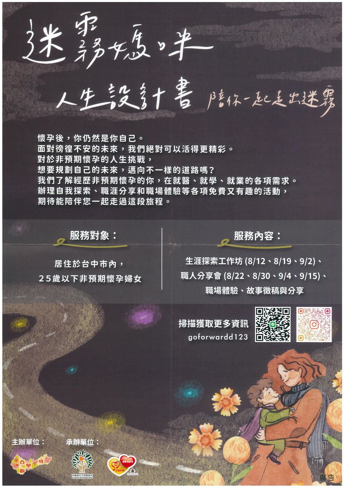 | 就業輔導組 | 轉知:臺中市政府社會局「迷霧媽咪人生設計書」方案,辦理職人分享丶職場體驗及故事徵稿等活動 | 公文 EDM1 EDM2 |