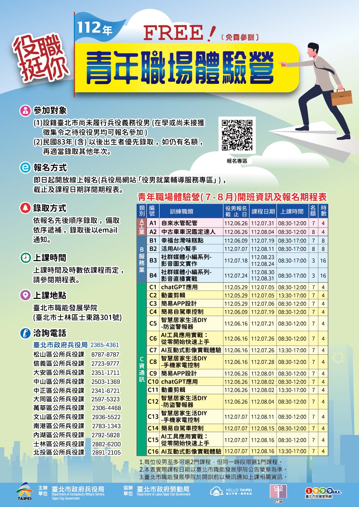 | 就業輔導組 | 轉知:臺北市政府兵役局辦理112年「青年職場體驗營」活動 | 公文 EDM |