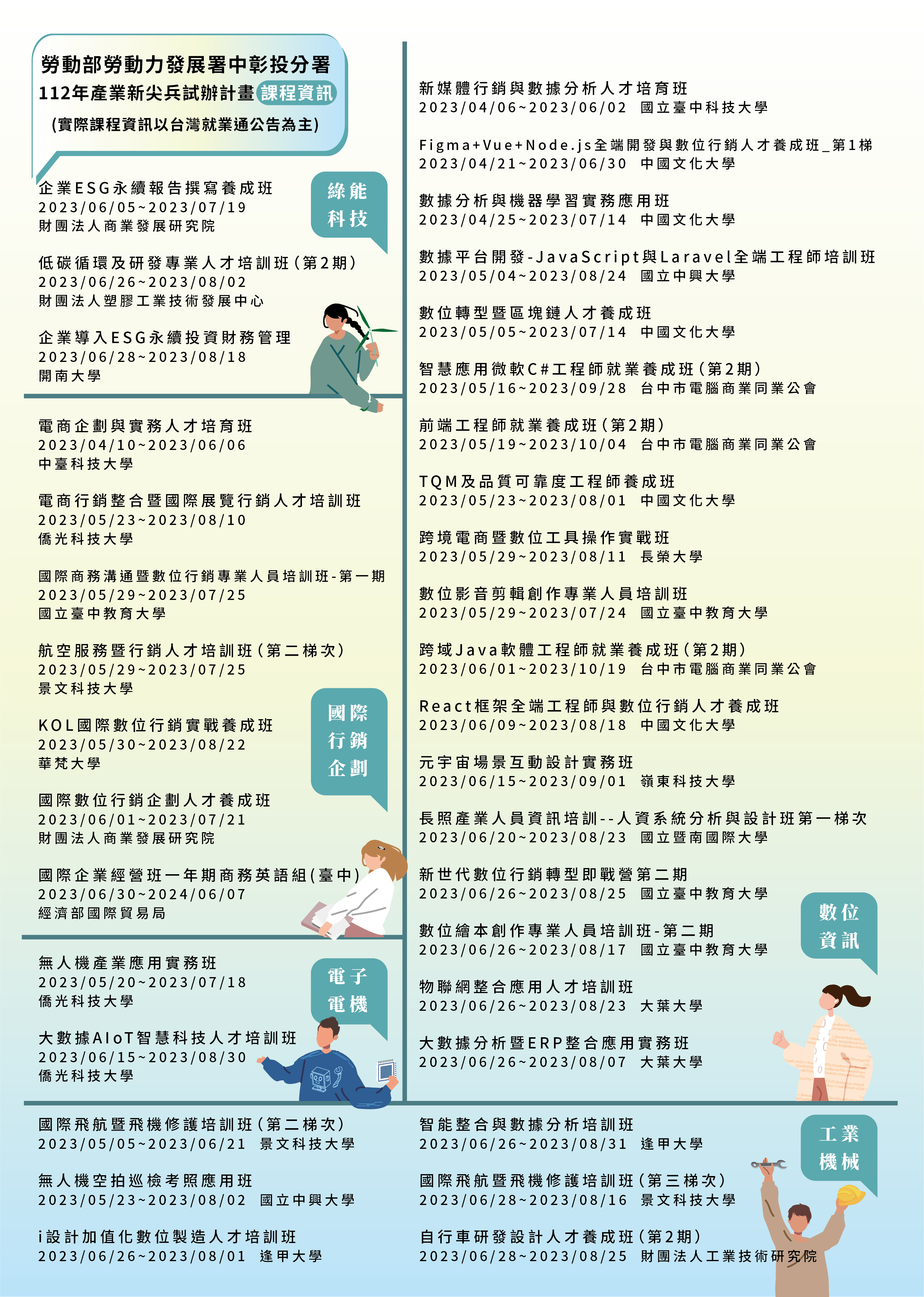 | 就業輔導組 | 勞動部112年「產業新尖兵試辦計畫」 | EDM01 EDM02 |