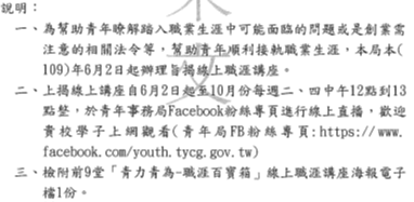 | 就業輔導組 | 主旨:青力青為 - 職涯百寶箱線上職涯講座 | 講座說明 |