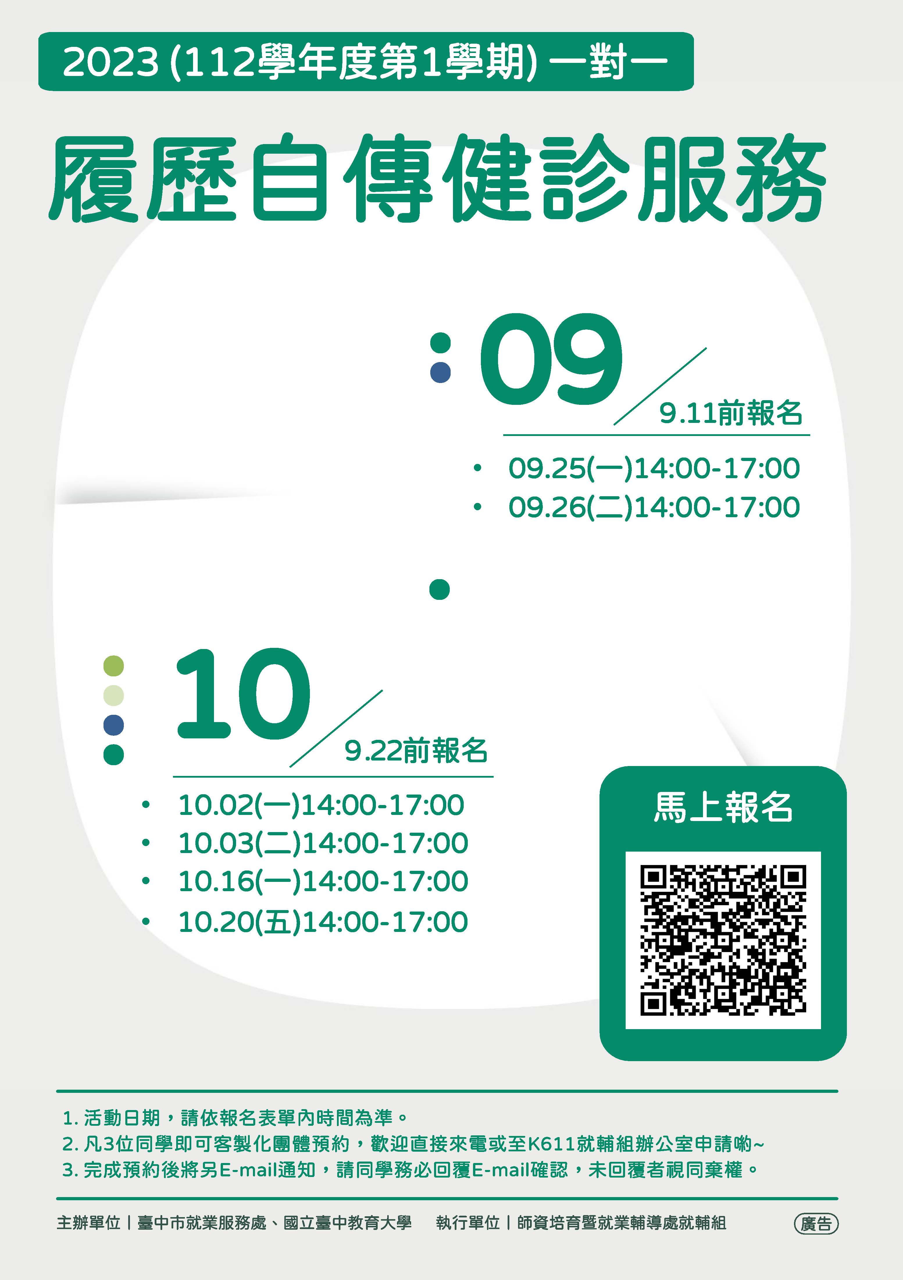 | 就業輔導組 | 【活動】本學期一對一履歷自傳健診諮詢服務,歡迎報名參加! | |