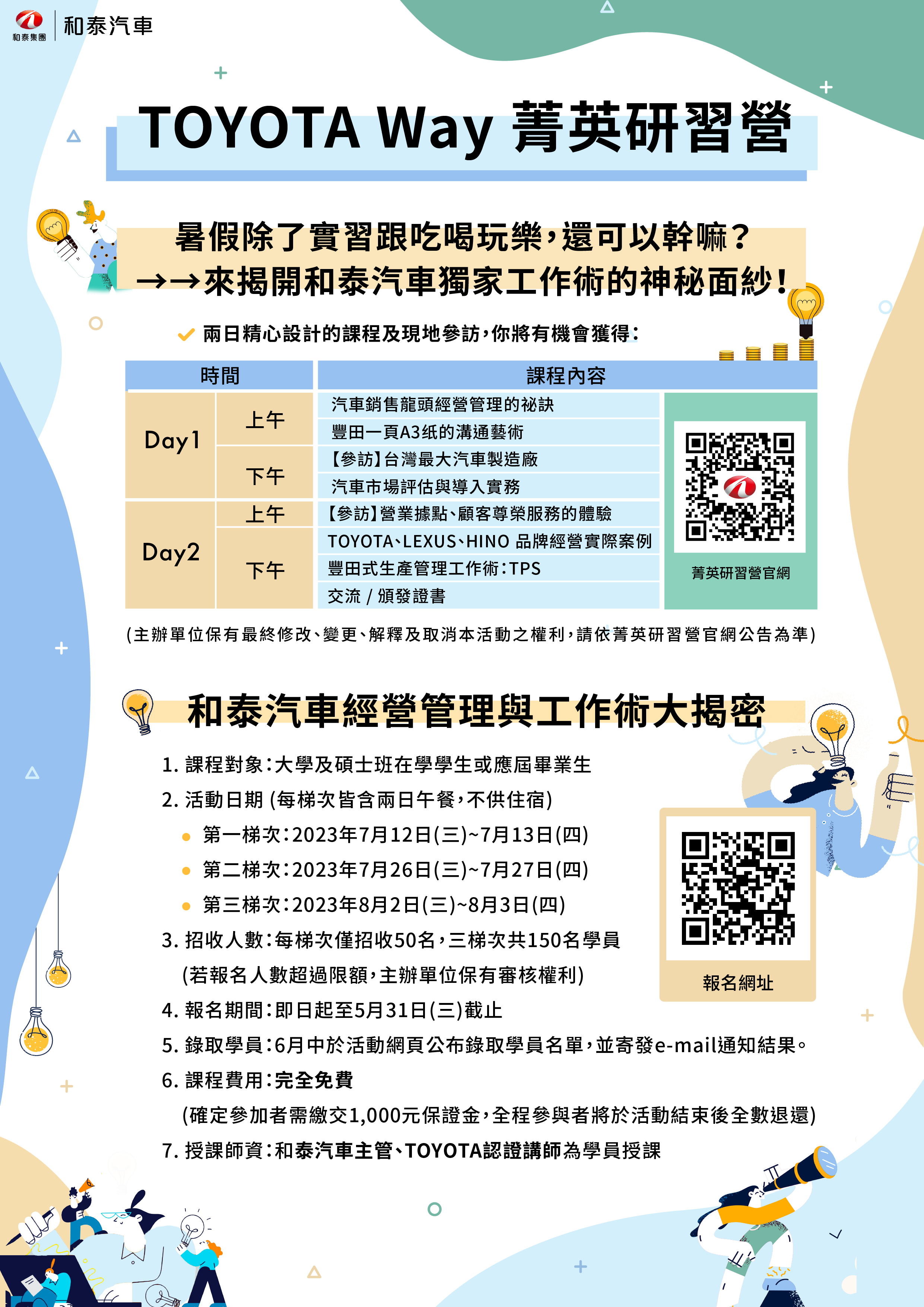 | 就業輔導組 | 【2023年 ─ 和泰汽車TOYOTA WAY菁英研習營報名中】 | EDM |